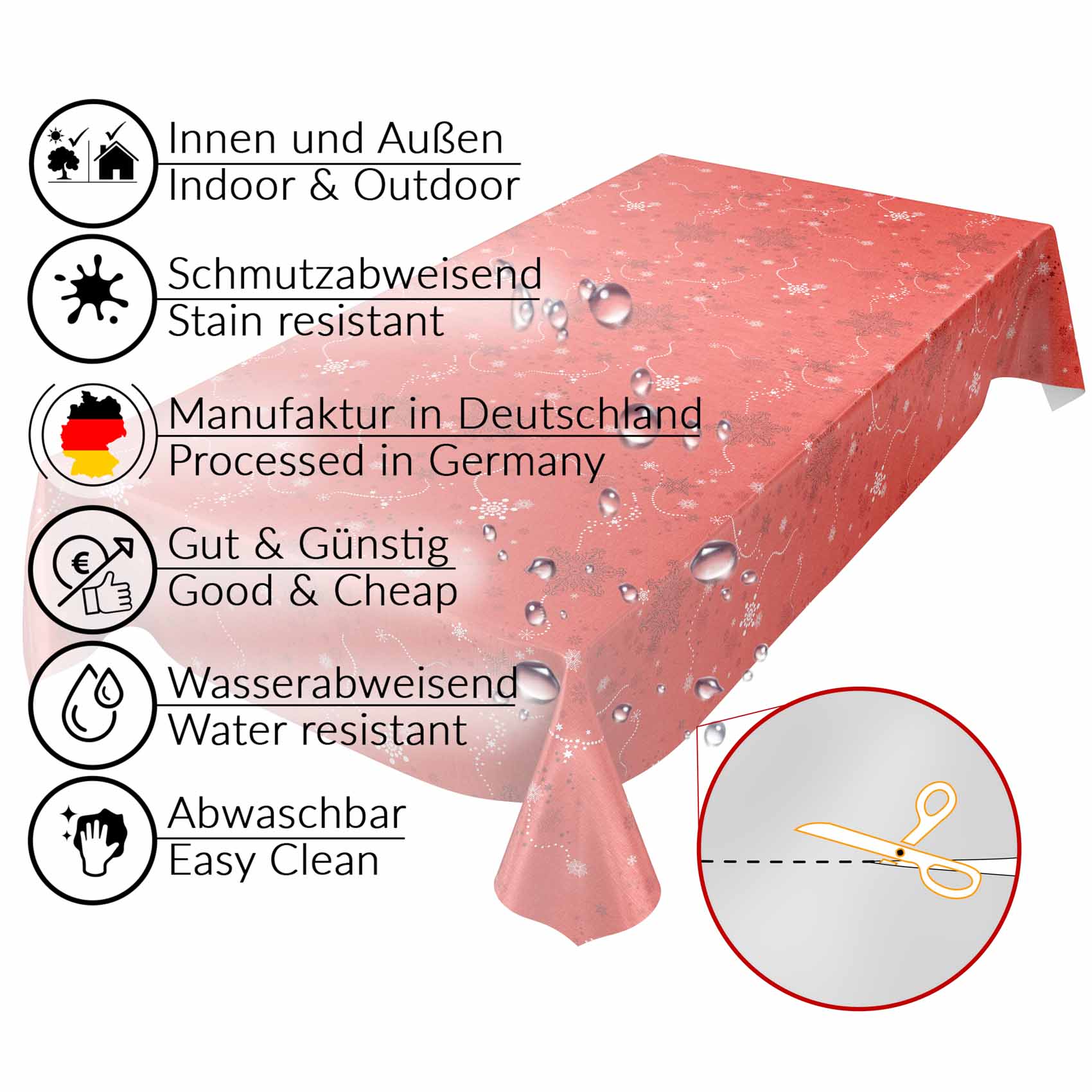 Unsere schmutzabweisende Wachstuch Tischdecke in Meterware erfreut sich aus verschiedenen Gründen großer Beliebtheit. Zum einen ist die abwaschbare Tischdecke besonders günstig. Im Gegensatz zu Stofftischdecken, ist es die perfekte Alternative, wenn Sie ein praktische, dekorative Tischdecke kaufen möchten, was ihnen den Alltag nachhaltig erleichtert. Das günstige Wachstuch in Meterware ist aus robustem PVC hergestellt und damit besonders reißfest, langlebig & wasserundurchlässig. Die Wachstischdecke kann einfach mit einem feuchten Tuch abgewischt werden und erspart damit lästige Reinigungskosten und -zeit im Alltag. Außerdem kann die Tischdecke, da sie Meterware ist frei konfiguriert bestellt werden und auf Wunsch können Sie auch noch vor Ort ganz einfach mit einem Cuttermesser oder einer Schere an den gewünschten Einsatzort anpassen. Zudem bietet die Wachstuchdecke den großen Vorteil, dass sie sowohl Indoor als auch Outdoor als Gartentischdecke einsetzbar ist. Die Wachstischdecke wird auf einer Papphülse aufgerollt versandt, sodass sie völlig faltenfrei bei Ihnen eintrifft.
