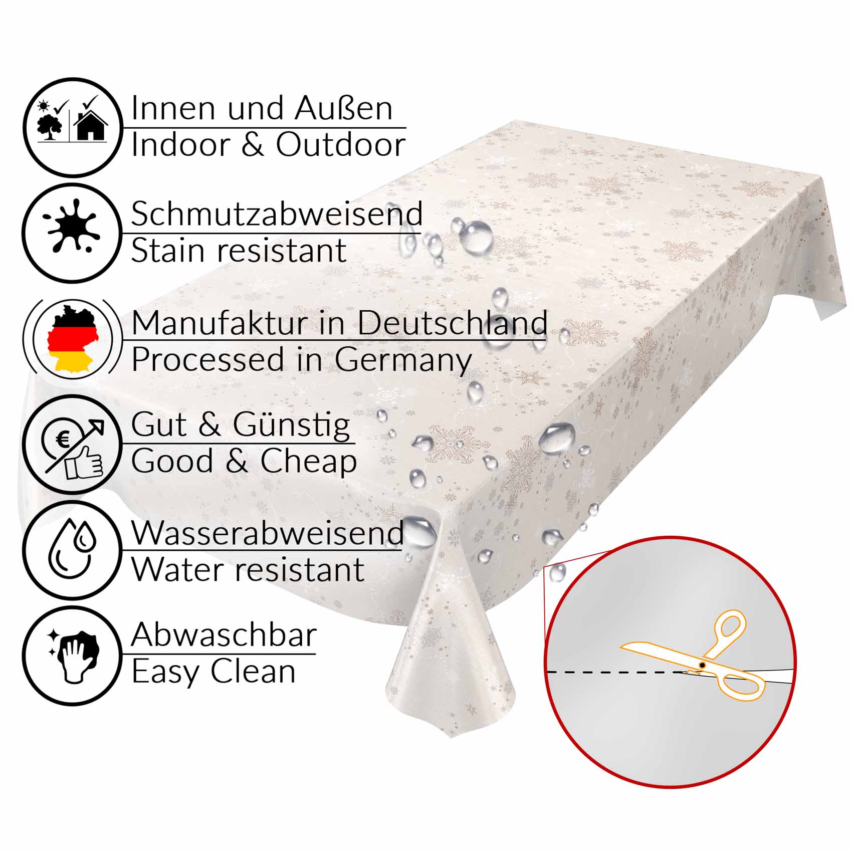 Diese wetterfeste Tischdecke erlaubt eine Mahlzeit bei jeglichem Wetter. Sollte es mal plötzlich regnen, dann muss sich keine Sorgen gemacht werden. Die Decke ist nämlich wasserundurchlässig und schmutzabweisend. Einfach mit einem feuchten Lappen geputzt ist die rutschfeste Decke schnell wieder sauber und bereit für das nächste Festmahl!
