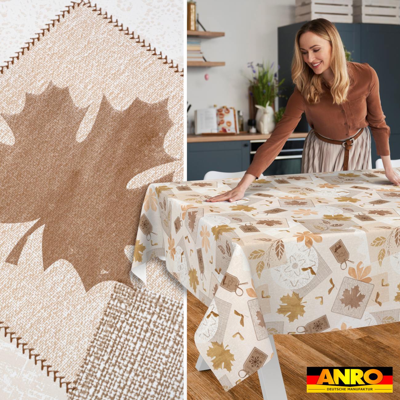 Bringen Sie saisonale Gemütlichkeit und stilvolle Akzente in Ihre Gastronomie, Hotellerie oder Eventausstattung – mit unserer Wachstuch Tischdecke im rustikalen Herbst-Look. Das detailreiche Design vereint verschiedene Blattformen und dekorative Anhänger mit Schneeflocken-Symbolen und Aufschriften wie „Happy Winter“. So entsteht eine einzigartige Tischdecke, die perfekt zur goldenen Herbstzeit passt und zugleich einen nahtlosen Übergang in die festliche Winter- und Weihnachtszeit ermöglicht.