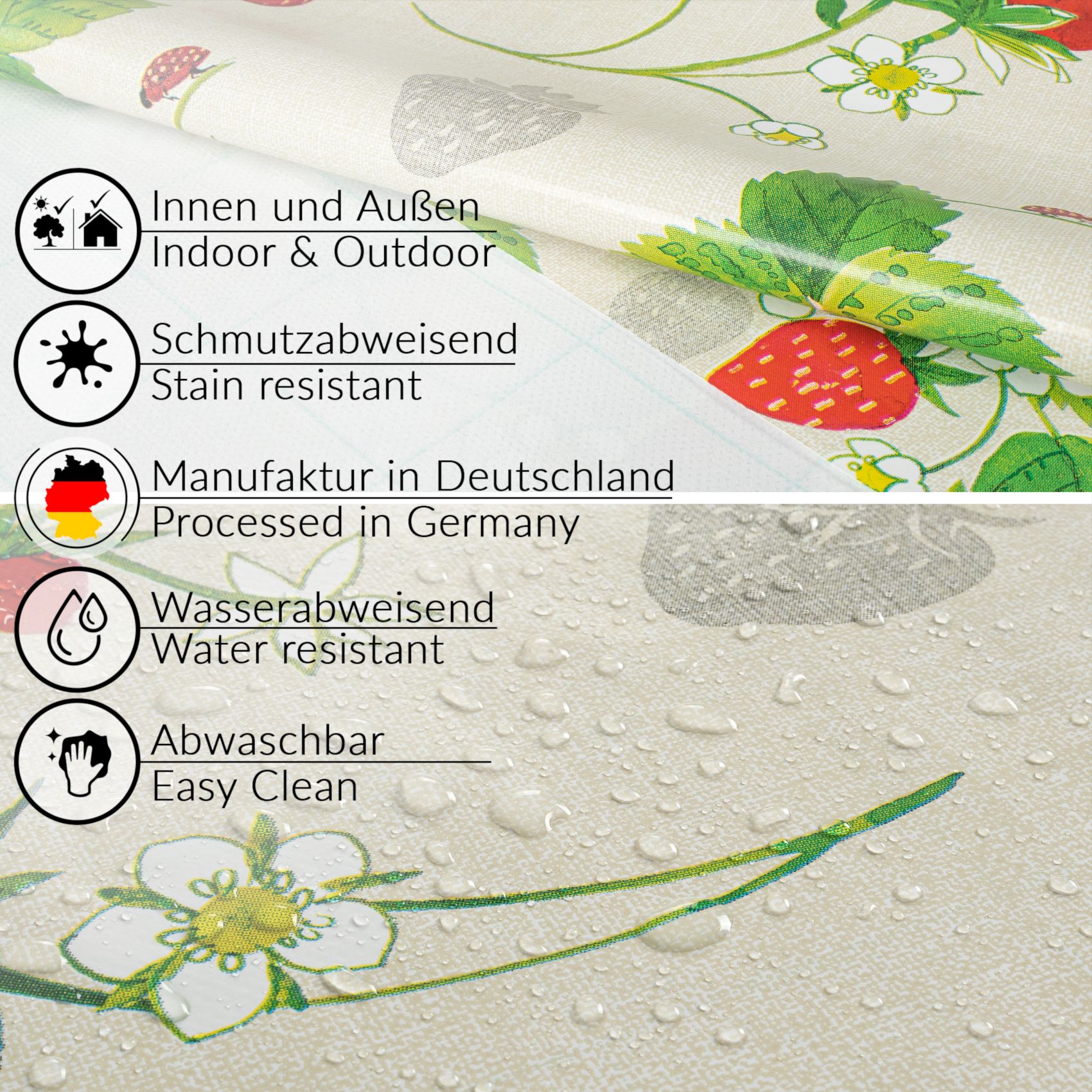 Vorteile der abwaschbaren Tischdecke in Meterware auf einem Blick: