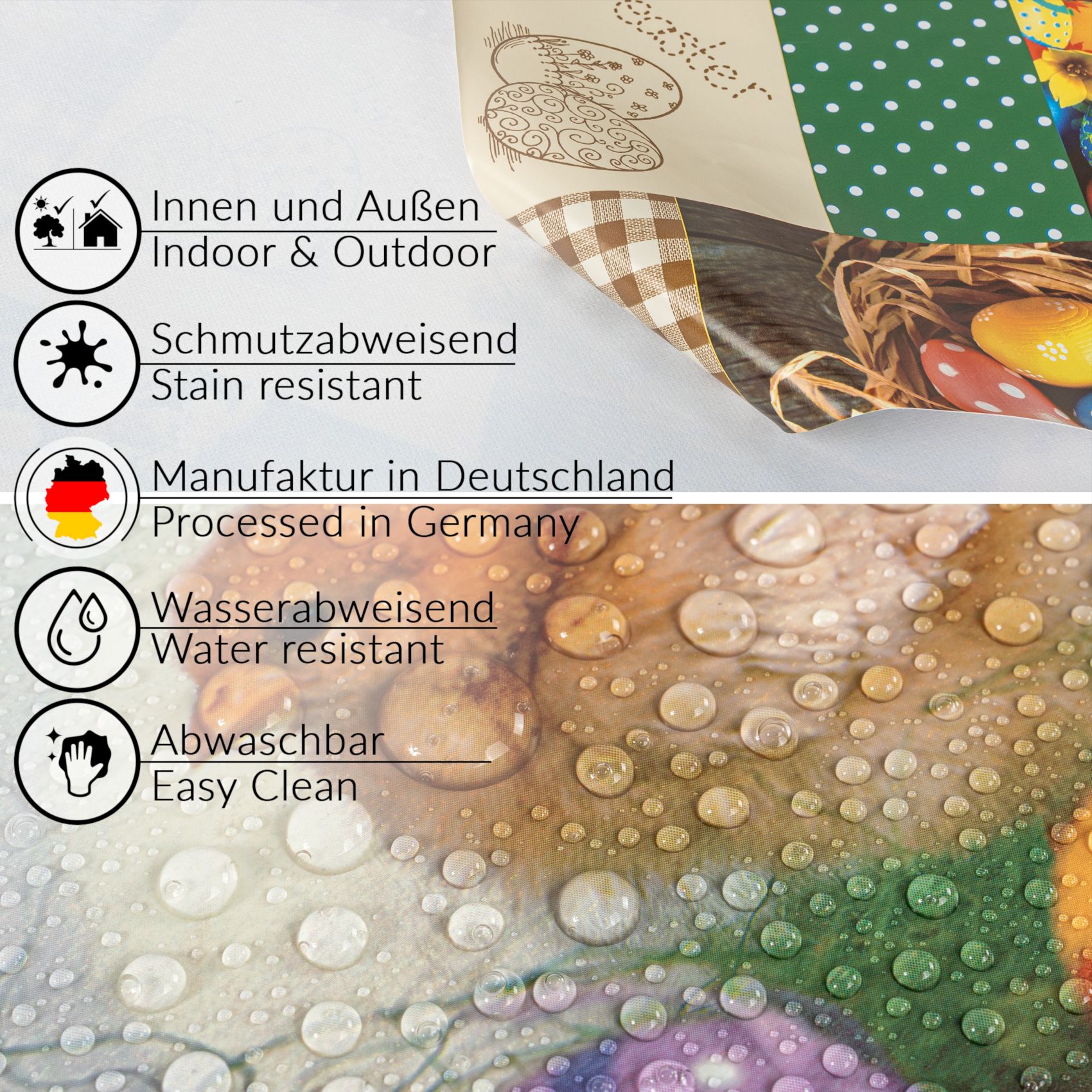 Vorteile der abwaschbaren Tischdecke in Meterware auf einem Blick: