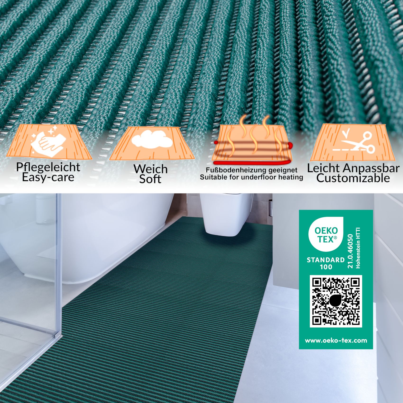 Der Badvorleger ermöglicht Ihnen eine individuelle Anpassung an Ihre Räumlichkeiten, indem Sie diese ganz einfach zuschneiden und auf die gewünschte Größe bringen können. Somit ist sie auch für größere Flächen geeignet und kann problemlos an jede Raumsituation angepasst werden. Nutzen Sie unsere rutschfeste Weichschaummatte in Meterware für Ihre Büroräume, Küchen oder auch für den Einsatz in der Sauna oder auf der Terrasse. Sie werden von ihrer hohen Qualität und Vielseitigkeit begeistert sein.